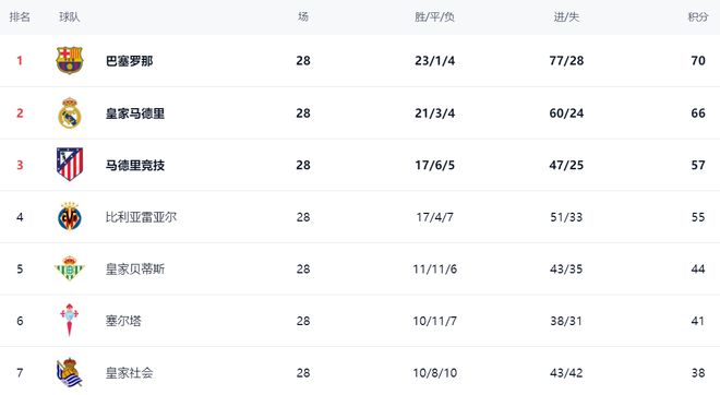在积分榜上,巴萨继续领跑,拿到70分,战绩是23胜1平4负。巴萨继续压制皇马,领先4分。皇马以66分屈居第2名。马竞只拿到57分,排名第3。第4的是比利亚雷亚尔,拿到55分。皇家贝蒂斯只拿到一场平局,总积分是44分,排名第5,与身前的球队差距巨大。塞尔塔总积分41分,排第6。