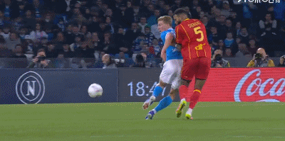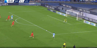 第46分钟,扳平比分,波利塔诺助攻,霍伊伦抢点破门,那不勒斯1-1莱切