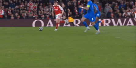 其实在这次进攻里,你依然可以看到问题,比如哲凯赖什这一点如果换做身体相对轻便的点位,回接过程中降速可以更快,停球就不必这么大,本-怀特的脚下调整也不必这么多,但在勒沃库森难以封闭空间的情况下,这些问题都不致命了,照样可以及时送进人在右肋的萨卡,后者完成转身,便衔接到了拉边冲击的哲凯赖什: