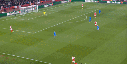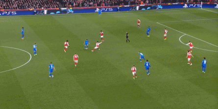 但是,随着队形的向前,三线的距离就会变得难以保持,这是面对比分落后的球队最难以处理的问题,也是比分领先的球队需要把握的机会,所以到了下半场,阿森纳依然可以通过长传球打进两线之间,从而衔接射门: