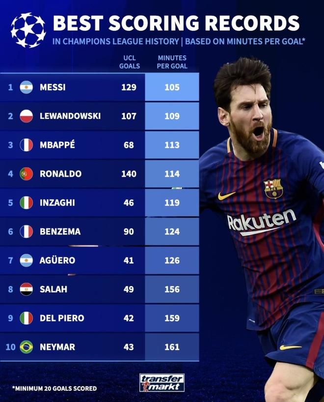 欧冠历史进球效率榜!虽然C罗进球排名第一 但效率比梅西低不少