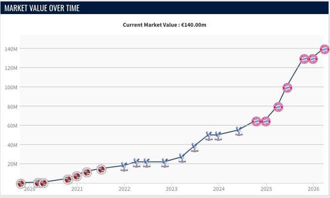 2025年10月,奥利塞的身价再次暴涨,身价来到1.3亿欧,而本期更新后他的身价来到1.4亿欧,领跑德甲身价榜。